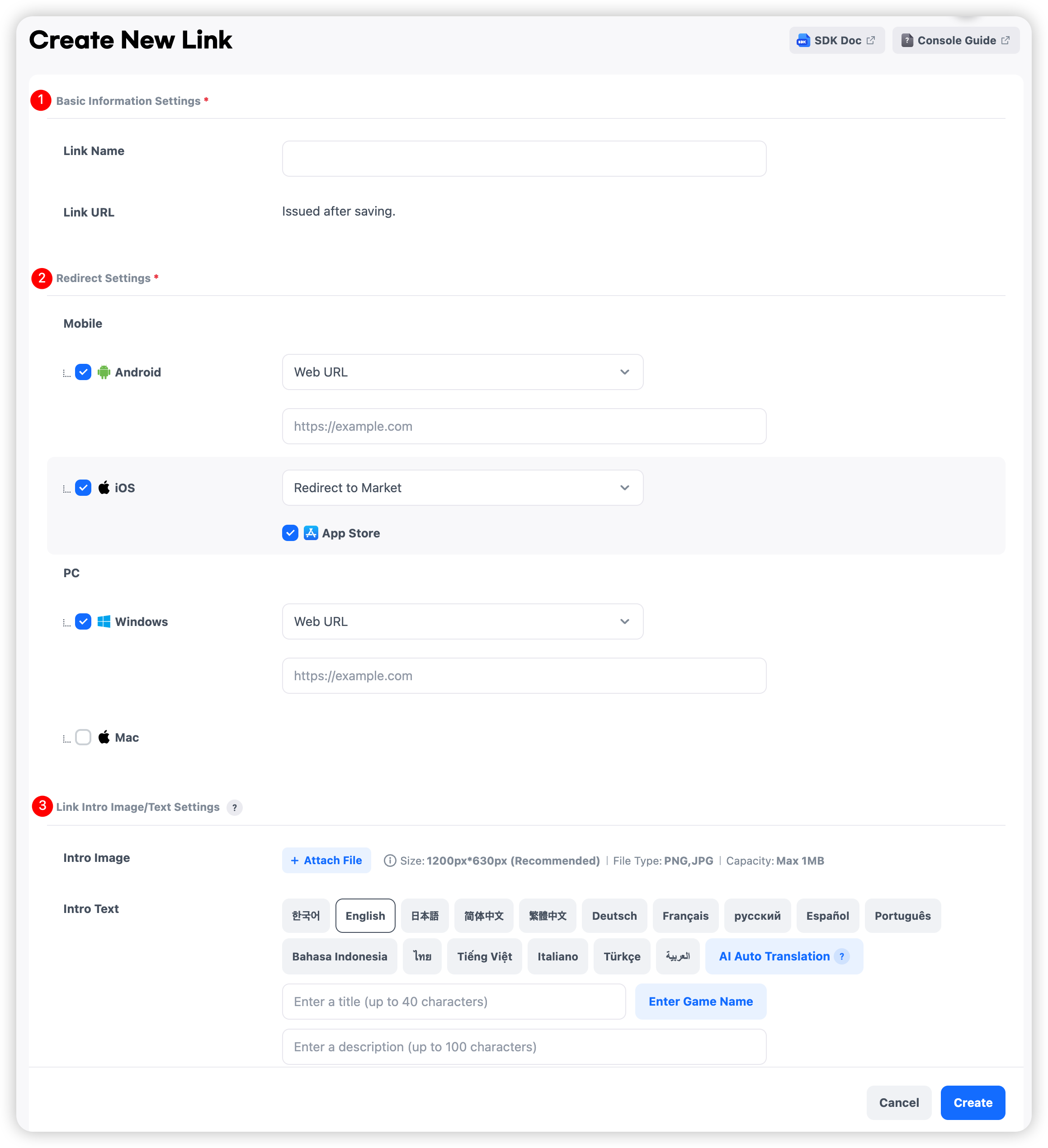 - リンクURL: ユーザーのOSを自動的に検出し、適切な宛先にリダイレクトする短縮リンクです。必要な情報を入力した後、リンクを自動的に生成するには「作成」をクリックしてください。