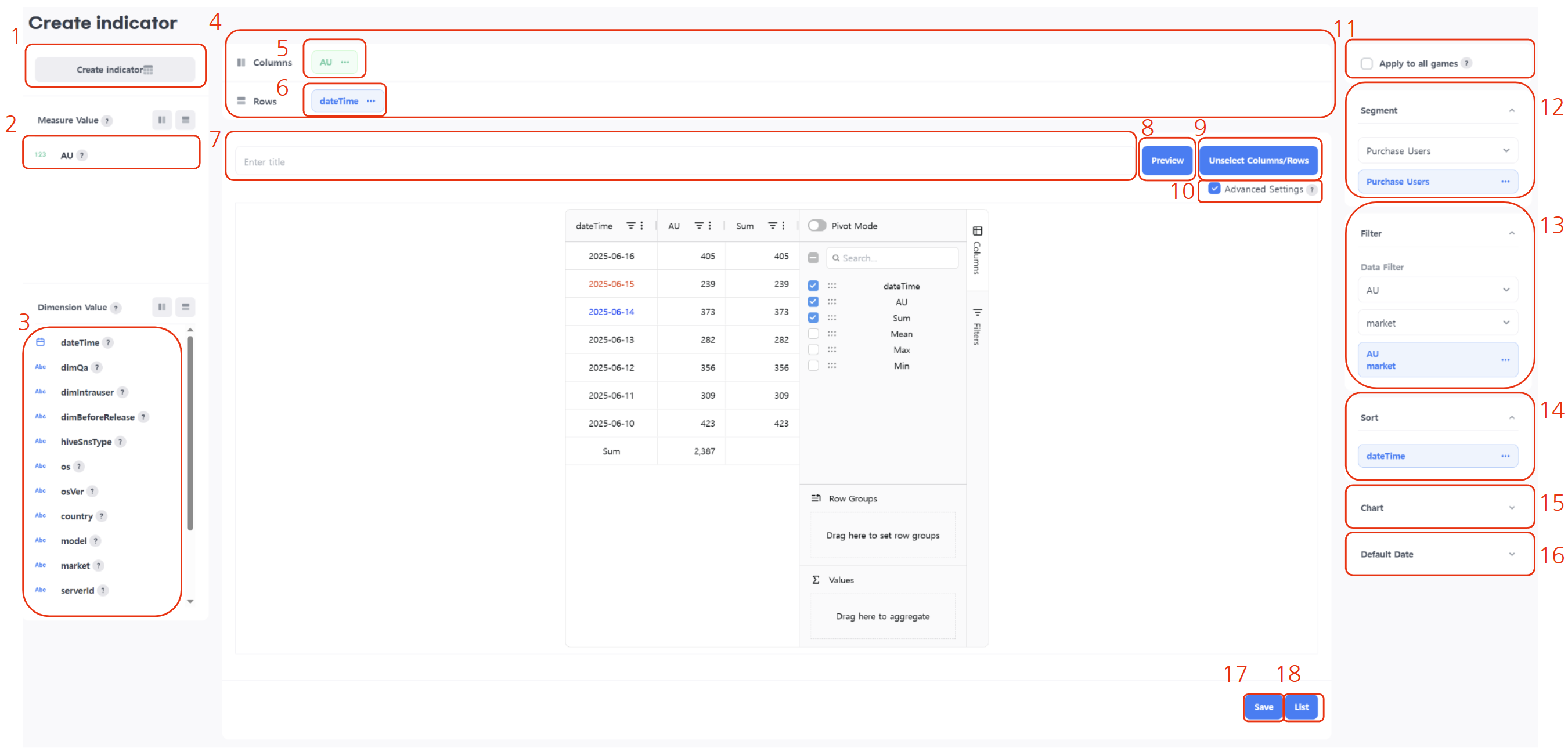 • インジケーター作成は、ユーザーが分析データを使用して自由に表やグラフを作成できる機能です。