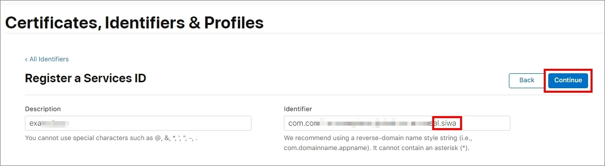 iOS以外のプラットフォームでAppleサインインを使用するには、以下の手順に従ってApp Store ConsoleからサービスID、チームID、キーID、およびプライベートキーを取得し、サインイン設定メニューに登録してください。