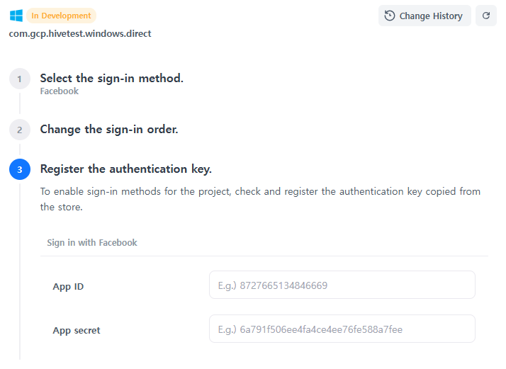 - 各ストアから提供される認証キーをコピーし、サインイン設定ページに貼り付けます。すべてのサインイン方法がサインイン設定メニューに認証キーを登録する必要があるわけではなく、一部はHive SDKに直接登録する必要があることに注意してください。各ストアの認証キーを登録するための詳細な手順は以下に示されています。