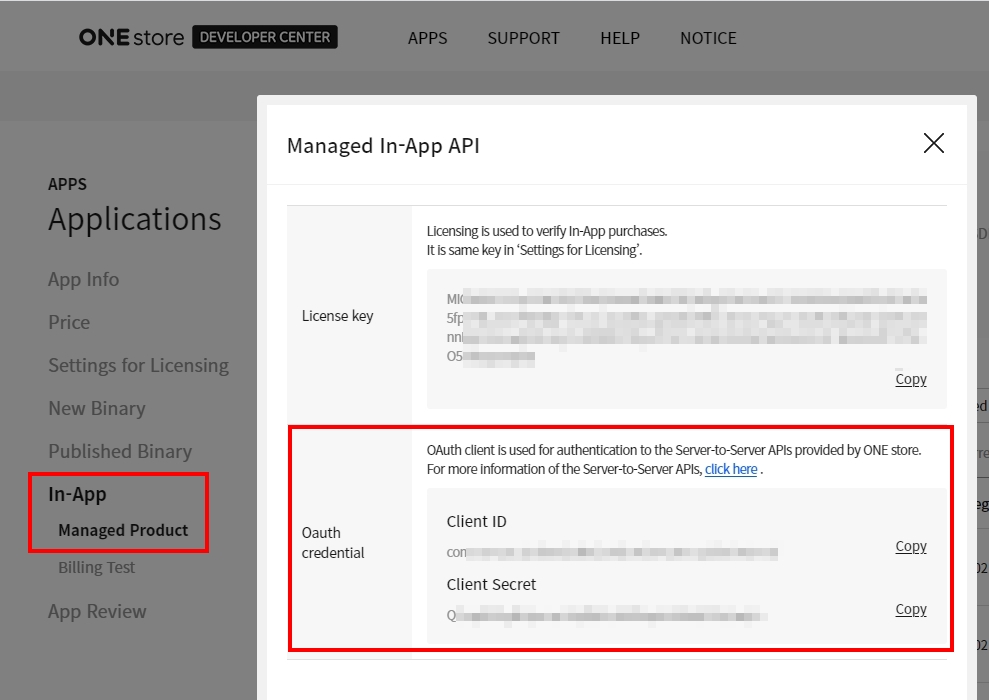 3. アプリ > 製品のステータス > アプリ内情報 > 製品を管理 > アプリ内API管理のOAuth認証情報でクライアントIDとクライアントシークレットを確認します。