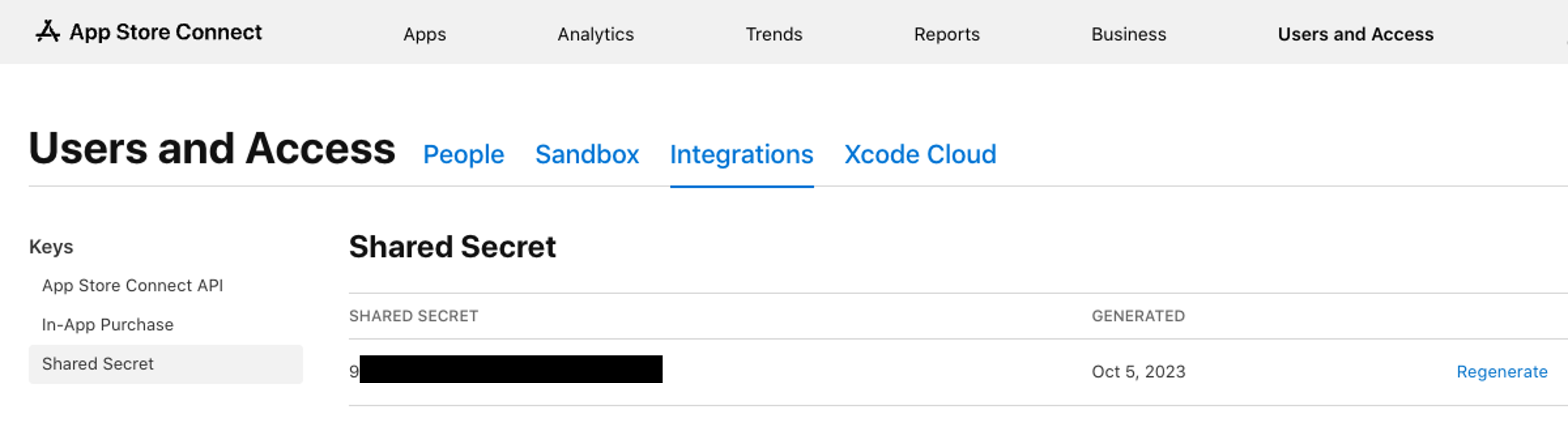 2. ユーザーとアクセス > 共有秘密 > 作成に移動します。新しい共有秘密が生成されると、自動更新サブスクリプションを使用しているすべてのアプリはこの新しい値を使用する必要があります。