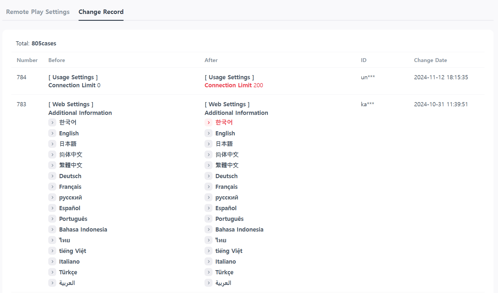 リモートプレイの設定でコンテンツを変更または登録すると、保存前後のすべての変更が自動的に記録されます。変更履歴を確認して更新を追跡します。