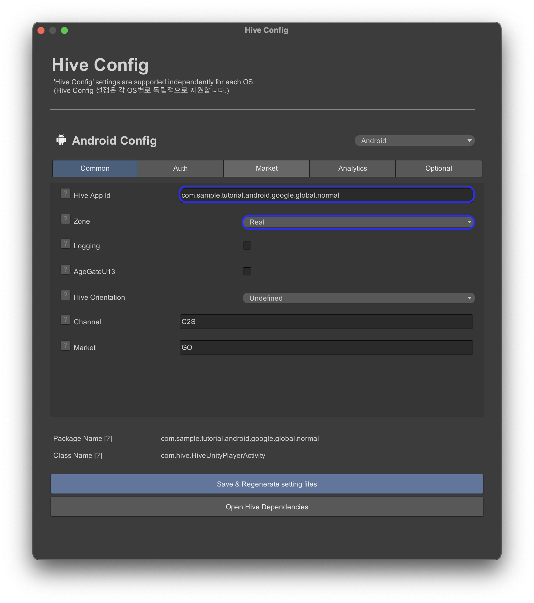 - Hive > Hive Config(Android) メニューで以下のように設定します。