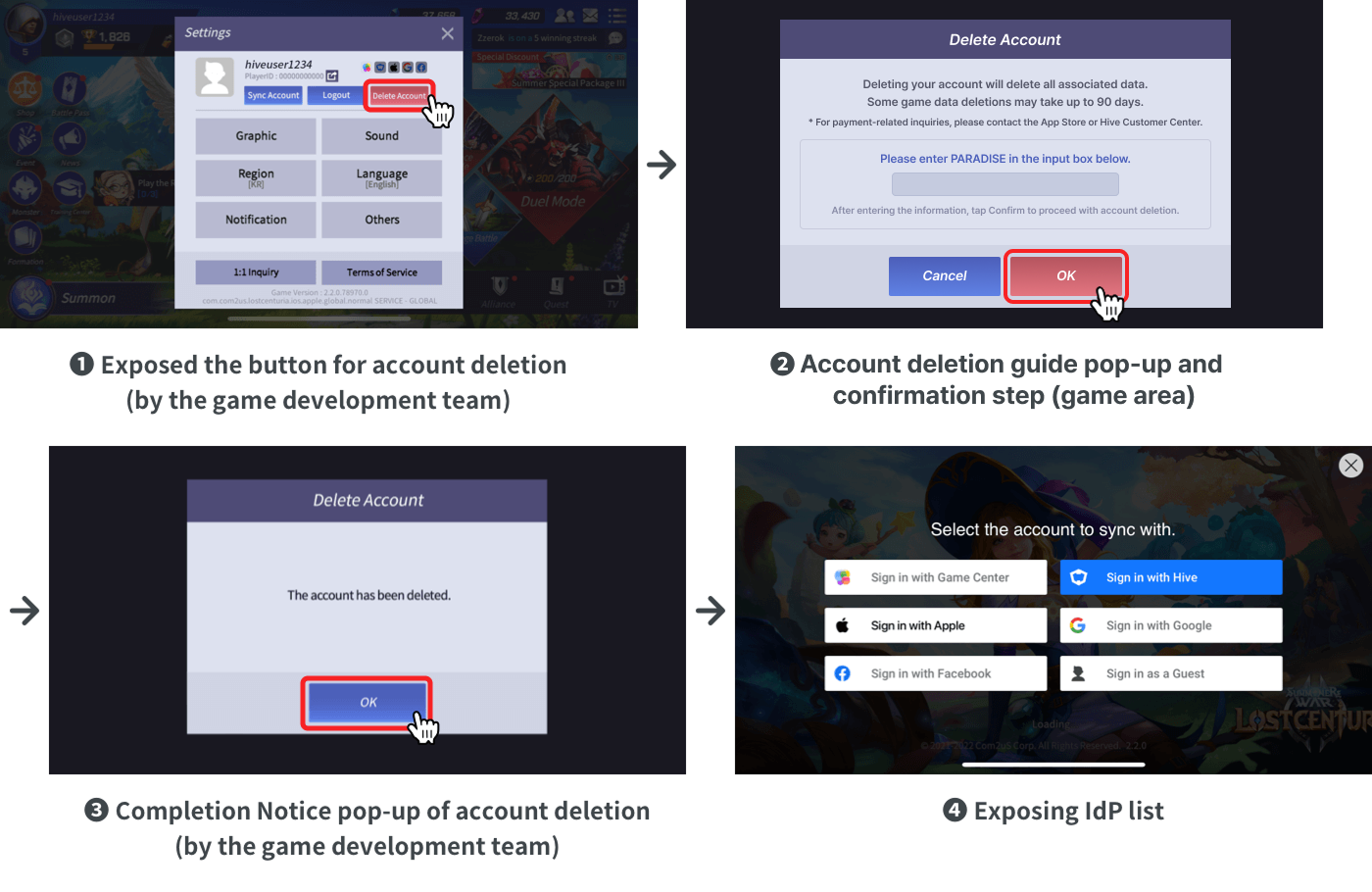 アカウントがゲームクライアント側で削除されると、ゲームサーバーは Hive サーバー API 認証削除 v4 アカウント を呼び出して、削除されたアカウントの情報を認証サーバーに送信する必要があります。認証サーバーはこの情報を受け取り、アカウントを削除します。削除後、認証サーバーはアカウント削除の結果をゲームサーバーに送信し、ゲームサーバーはこれをゲームクライアントに渡します。ゲームクライアントがアカウント削除の結果を受け取ると、アカウントが削除されたことを通知するポップアップを表示する必要があります。ゲームクライアント側(Hive SDK)では、アカウントが削除された後、アカウントがIdP ベースかゲストアカウントかに関わらずsignOut()を呼び出します。 -