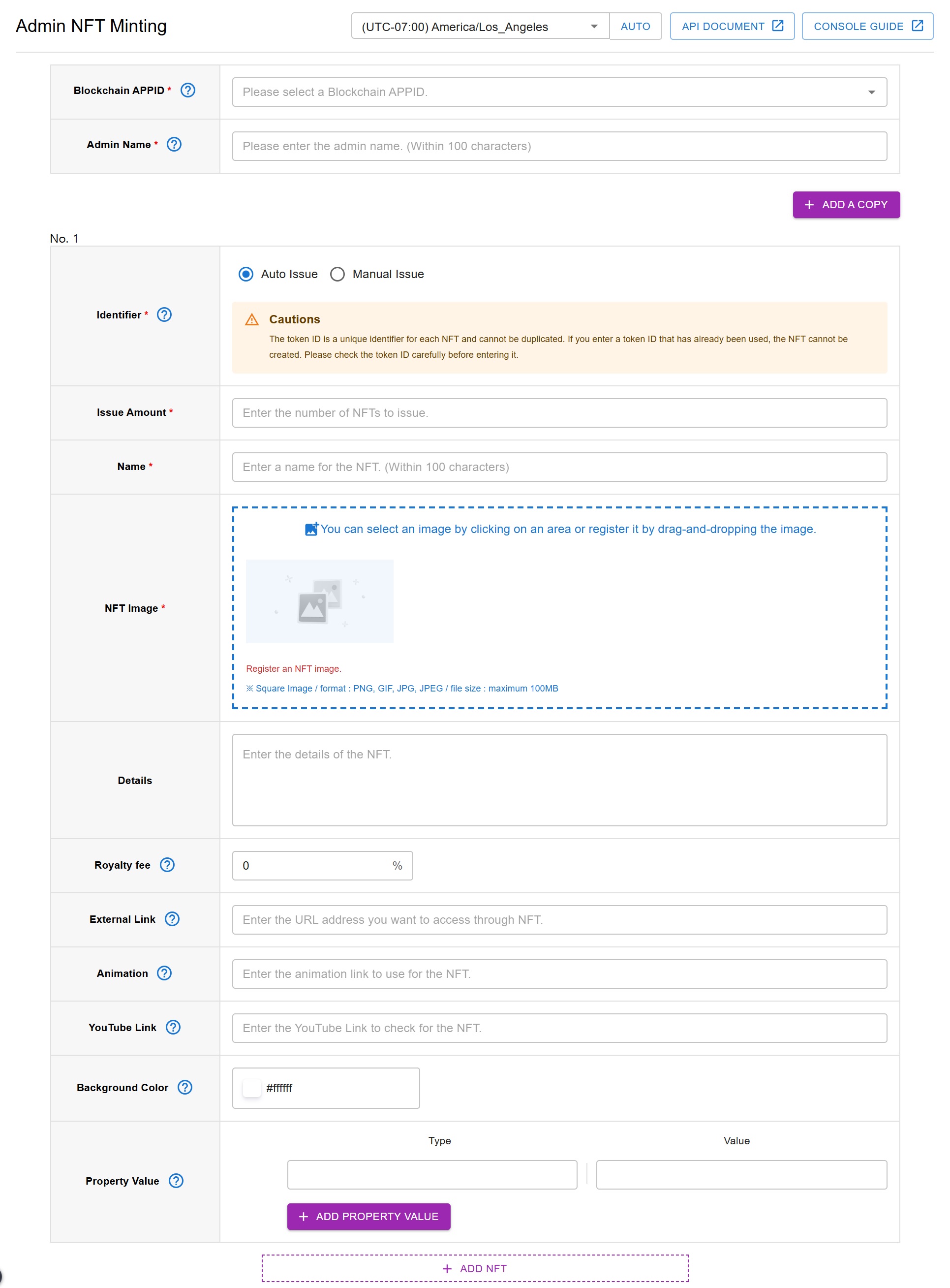 - 手動ミント: 管理者がユニークな識別子を手動で入力します。重複は許可されていません—以前に削除されたNFTでも同じ識別子を再利用することはできません。