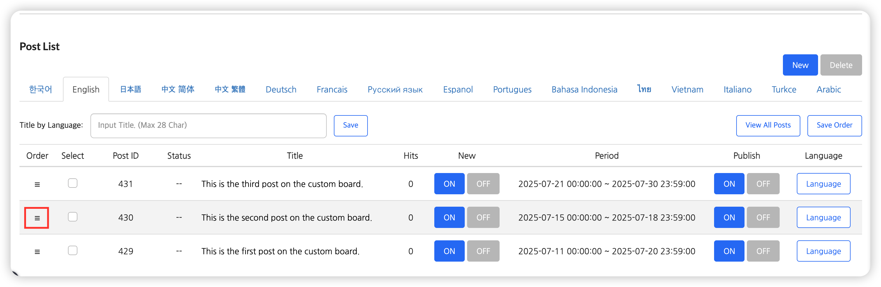 アイコンをドラッグ&ドロップして投稿の順序を変更してください。投稿の順序を再配置し、「順序を保存」ボタンをクリックしてください。 順序は投稿IDによって管理され、すべての言語で同期されます。 change_order_1_en change_order_2_en