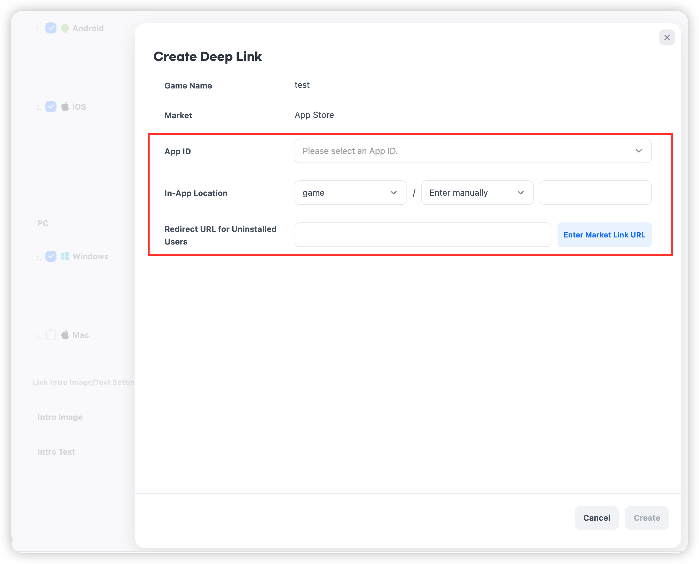 PCマーケット選択ページにリンクされるアプリIDを設定してください。PC環境でダイレクトリンクの宛先としてマーケットリダイレクトを選択すると、ユーザーはPCマーケット選択ページに移動し、そこでアプリをインストールして起動できます。