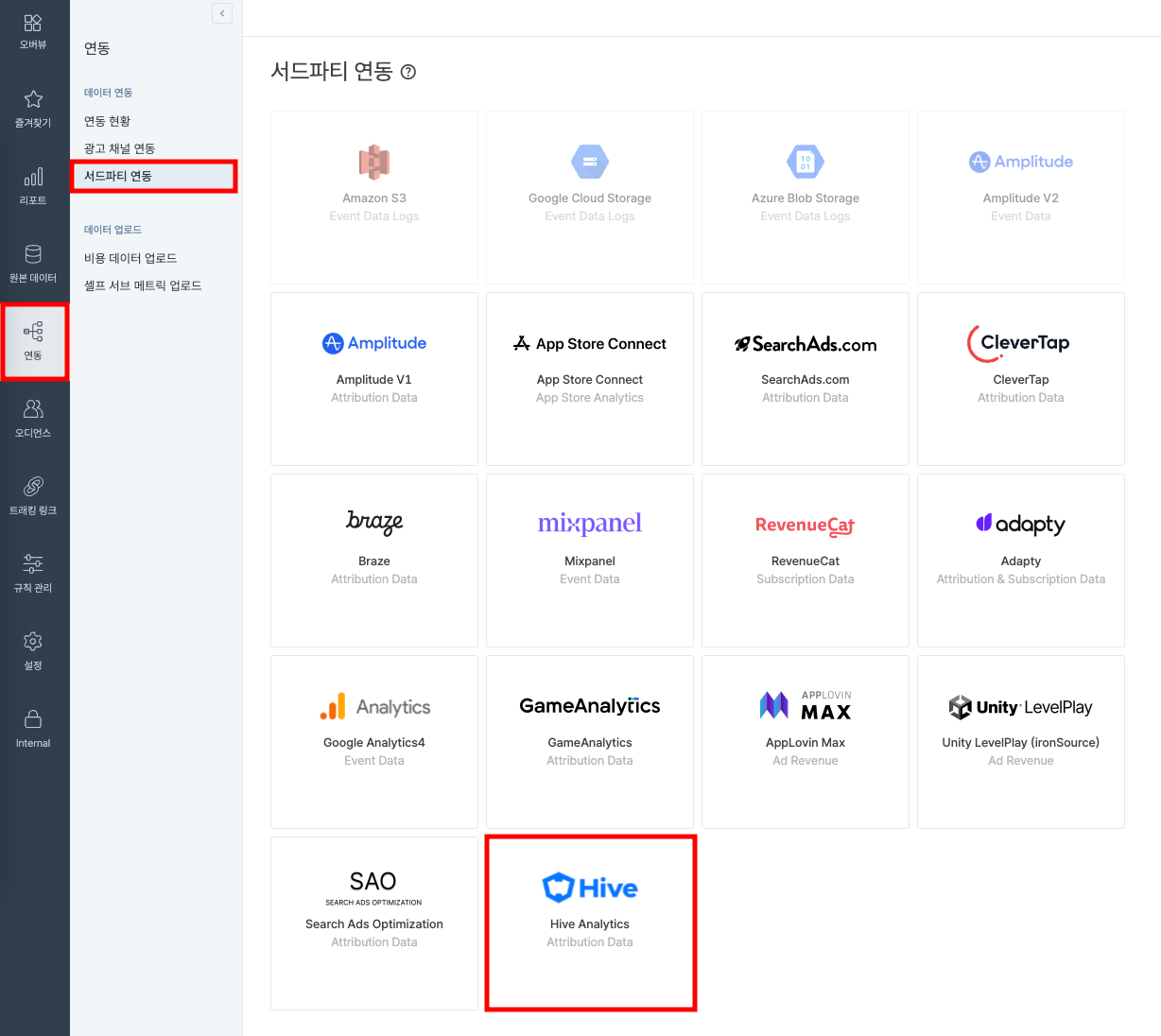 Airbridgeのダッシュボードで、統合 > **サードパーティ統合**の下にある**Hive Analytics**を選択します。