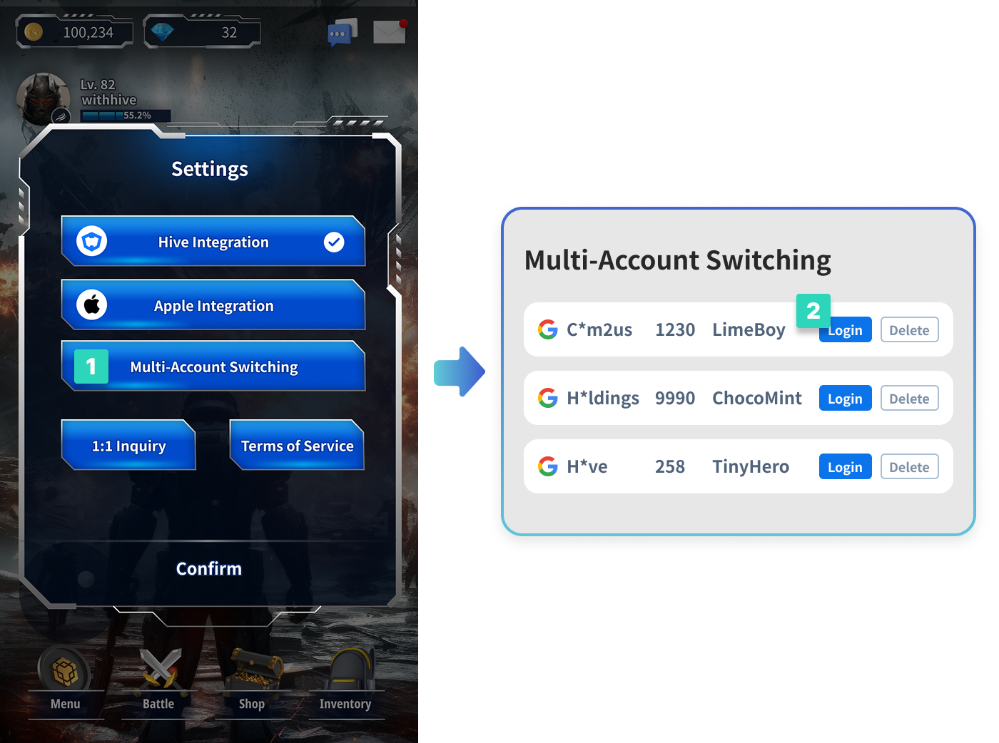 - 取得した保存されたアカウント情報を使用して、ユーザーが**マルチアカウント切り替え管理**をクリックしたときにPlayerIDリストUIを表示する機能を実装します