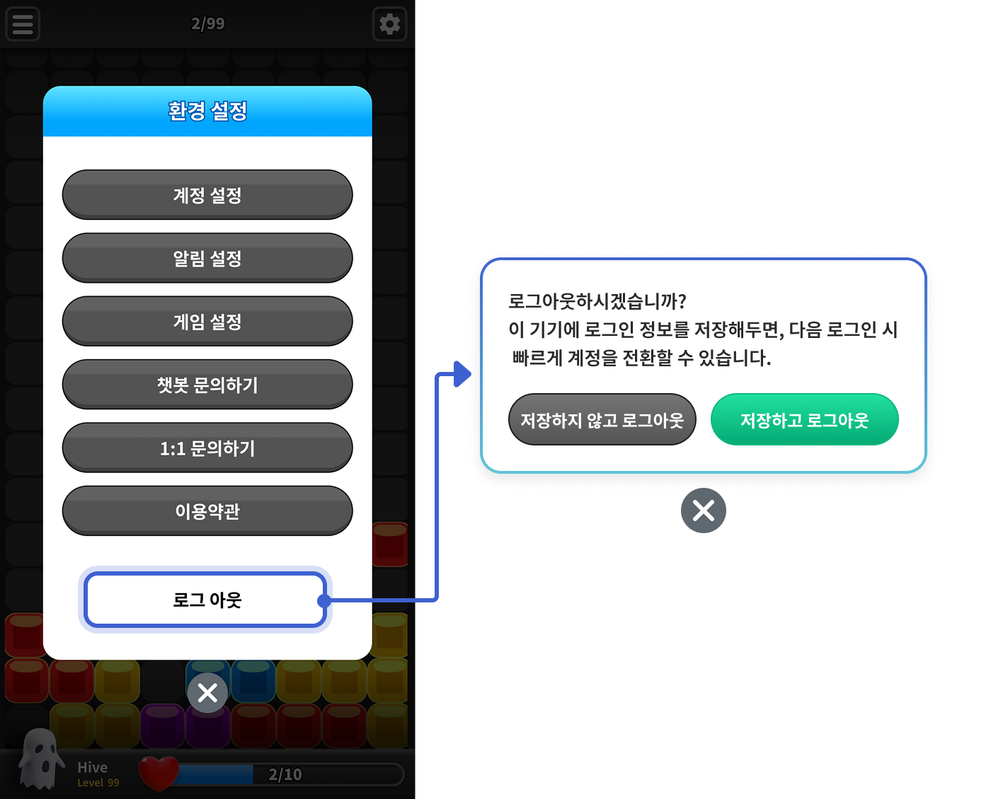 また、ログアウトする際に、ユーザーがログインしていてログアウトを選択した場合に、アカウントを保存するかどうかを尋ねるポップアップが表示されるフローを実装できます。そして、ユーザーが**保存してログアウト**をクリックすると、現在ログインしているアカウント情報を保存するためにアカウント保存APIが呼び出され、その後ログアウトします。関連するフローについては、上記のログアウト時のアカウント情報の保存シナリオを参照してください。