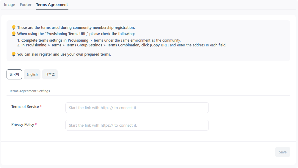 コミュニティに新たに加入すると表示される利用規約、個人情報取り扱い方針を設定します。ゲームを通じてコミュニティにアクセスし、アカウントが作成された場合、利用規約への同意手続きは省略されます。 ウェブログイン規約は必須設定項目で、設定しなければコミュニティへのログインが正常に動作しません