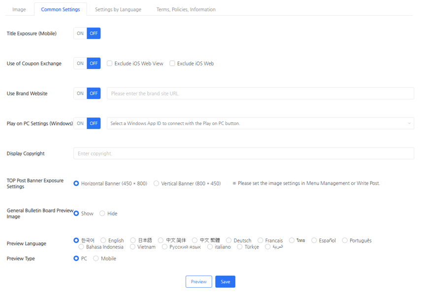 言語とデバイス(PC、モバイル)によってコミュニティサイトをプレビューできます。