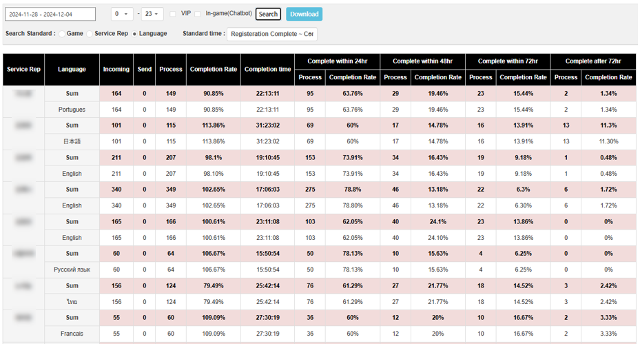 ゲーム別、エージェント別、言語別に対応できる問い合わせの対応時間を確認することができます。