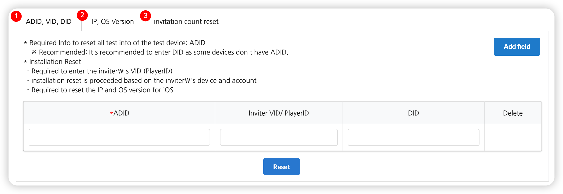 ただし、そのIPアドレスに関連するログは削除されません。IPに関連するPlayerIDログを完全に削除するには、ADID、VID、およびDIDを入力してリセットします。
