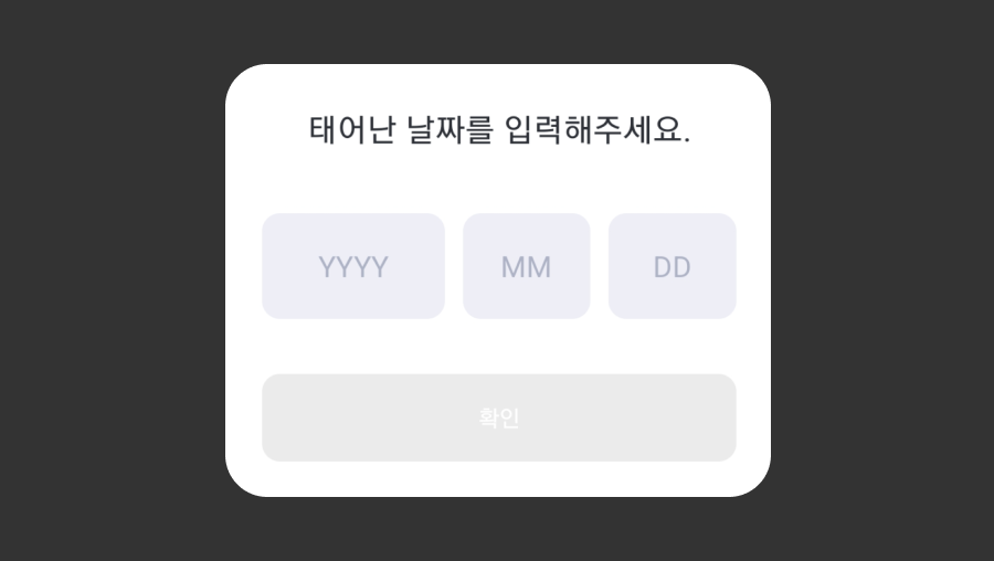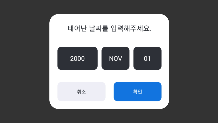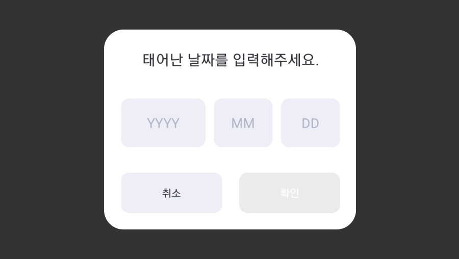 AuthV4.checkAgeGate는 사용자에게 생년월일 정보를 입력할 수 있는 팝업을 노출합니다. 사용자는 팝업의 연/월/일 항목에서 본인 생년월일을 선택할 수 있습니다. 사용자가 입력을 완료하면 AuthV4.checkAgeGate는 그 값(yyyy-MM-dd 포맷)을 콜백으로 반환합니다.