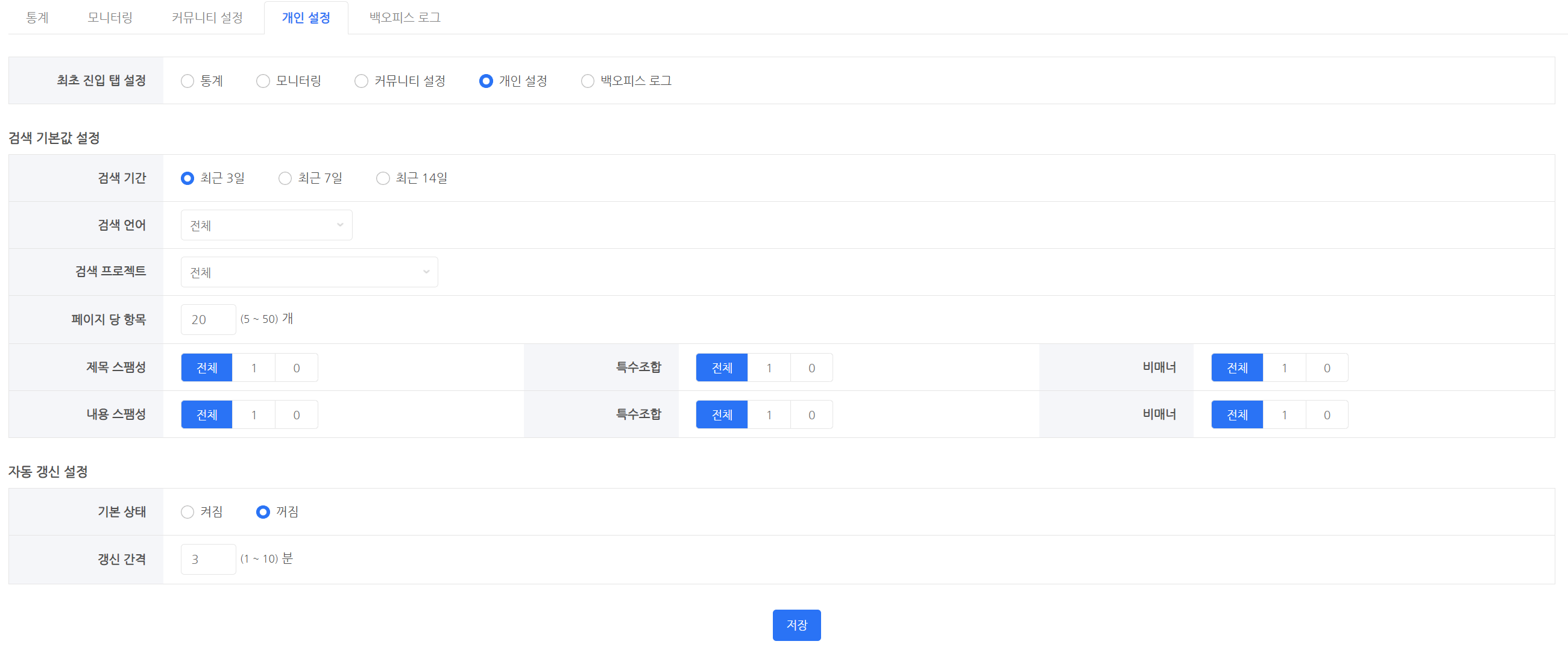 - 검색 기본값 설정: 통계 및 모니터링 탭에서 사용하는 필터의 기본값을 설정할 수 있습니다.