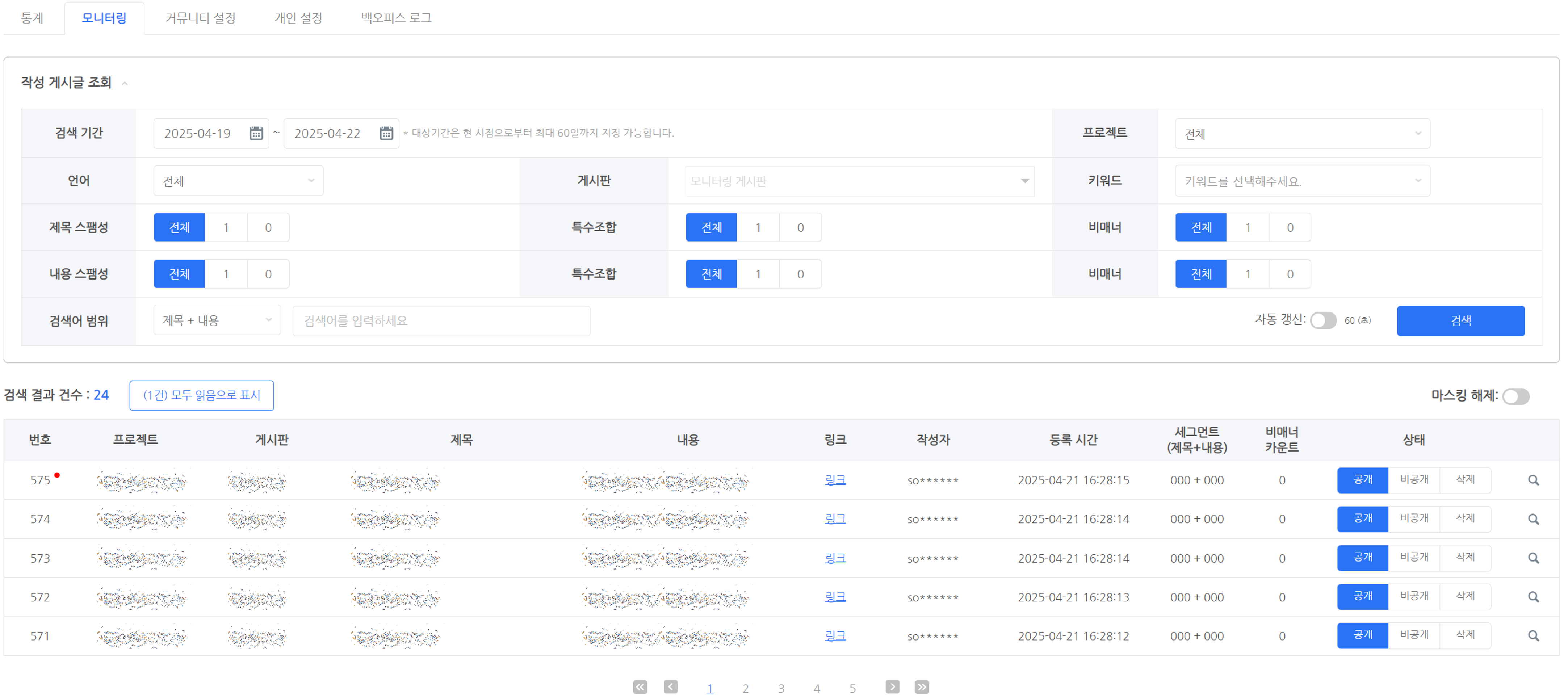 - 스팸성: 엔진 탐지 결과, 스팸으로 분류된 글을 조회할 수 있습니다(0: 비해당, 1:해당). 기본값은 전체입니다.