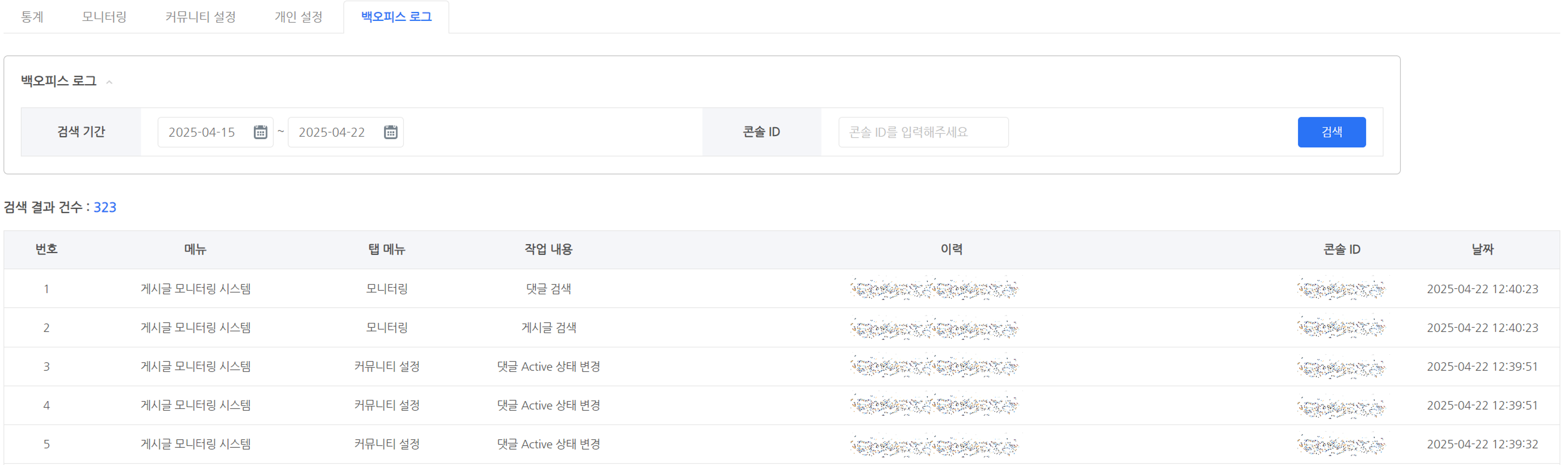 - 메뉴 위치: Hive 콘솔 > AI 서비스 > 커뮤니티 모니터링 > 게시글 모니터링 시스템