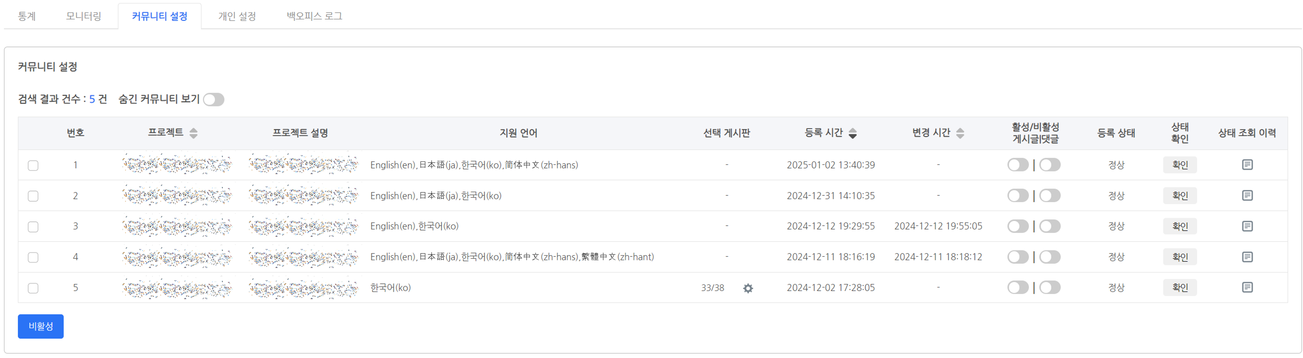- 체크 박스: 여러 개의 커뮤니티를 선택한 후, 삭제 버튼을 눌러 삭제할 수 있습니다.