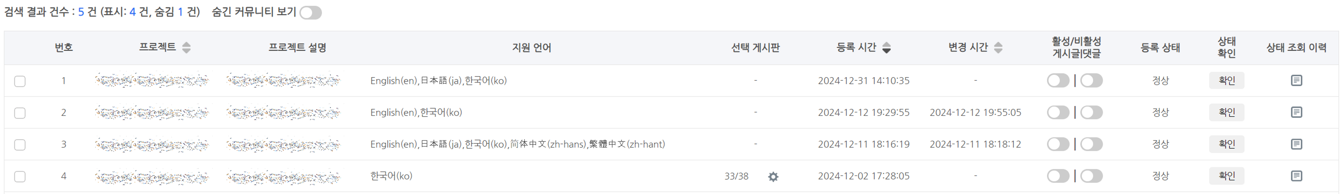 - 커뮤니티 이름: 커뮤니티를 구분할 이름을 지정합니다. 프로젝트, 커뮤니티 타입, 언어 선택 시 자동으로 {한국어 프로젝트명}_({언어})를 기본 커뮤니티 이름으로 제안하며, 변경도 가능합니다.