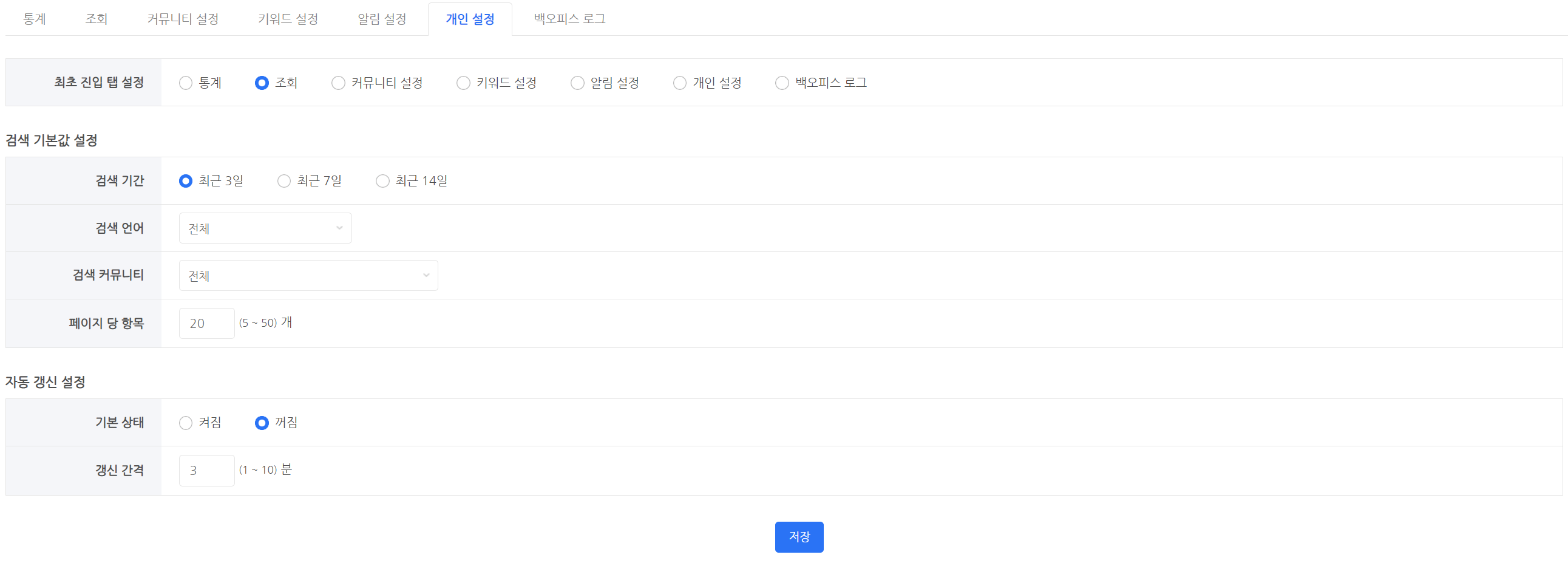 - 검색 기본값 설정: 통계 및 조회 탭에서 사용하는 필터의 기본값을 설정할 수 있습니다.