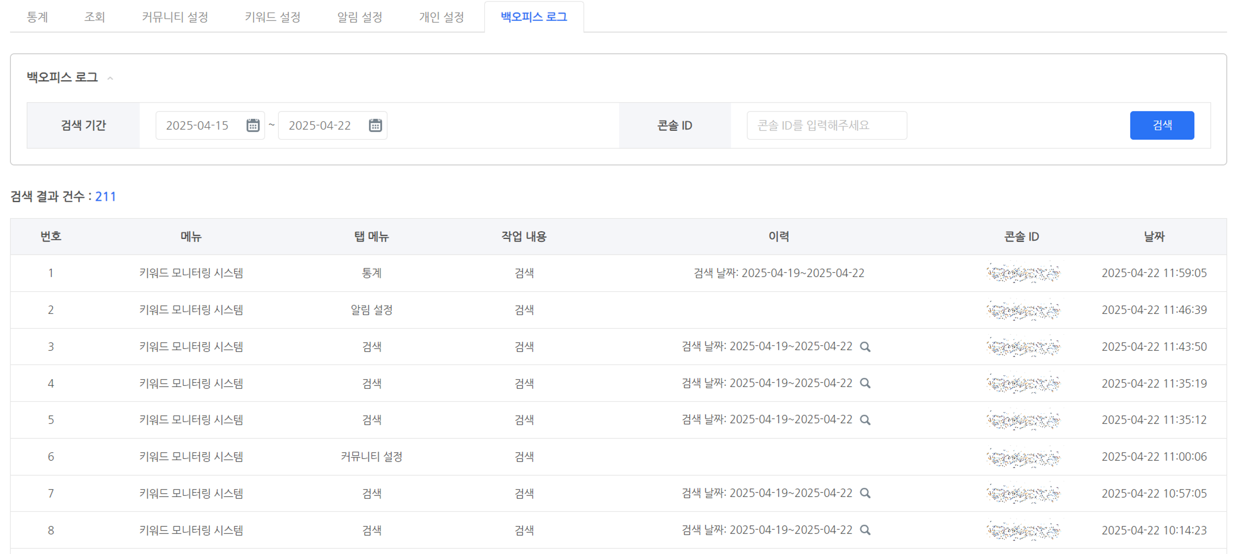 - 검색 기간 동안 발생한 조회, 등록, 수정, 삭제 등의 사용 로그를 확인합니다.