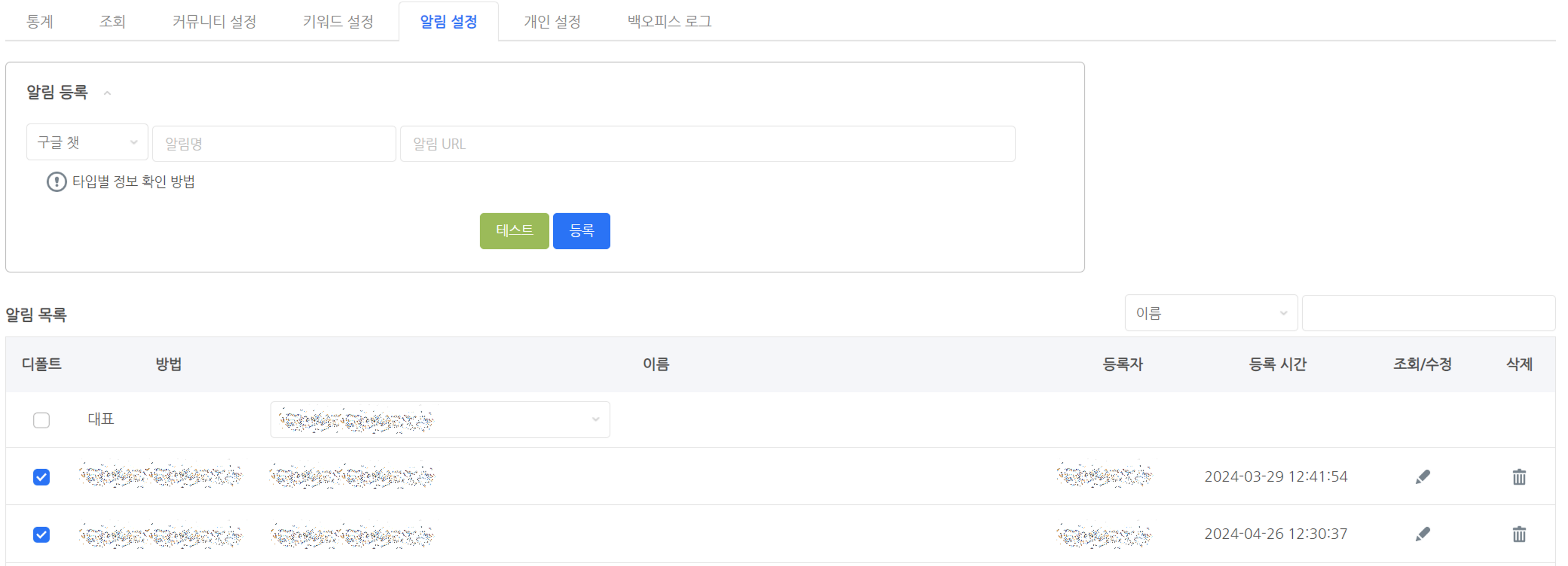 - 구글 챗(Google Chat): 구글 챗 웹훅 URL 정보 확인
