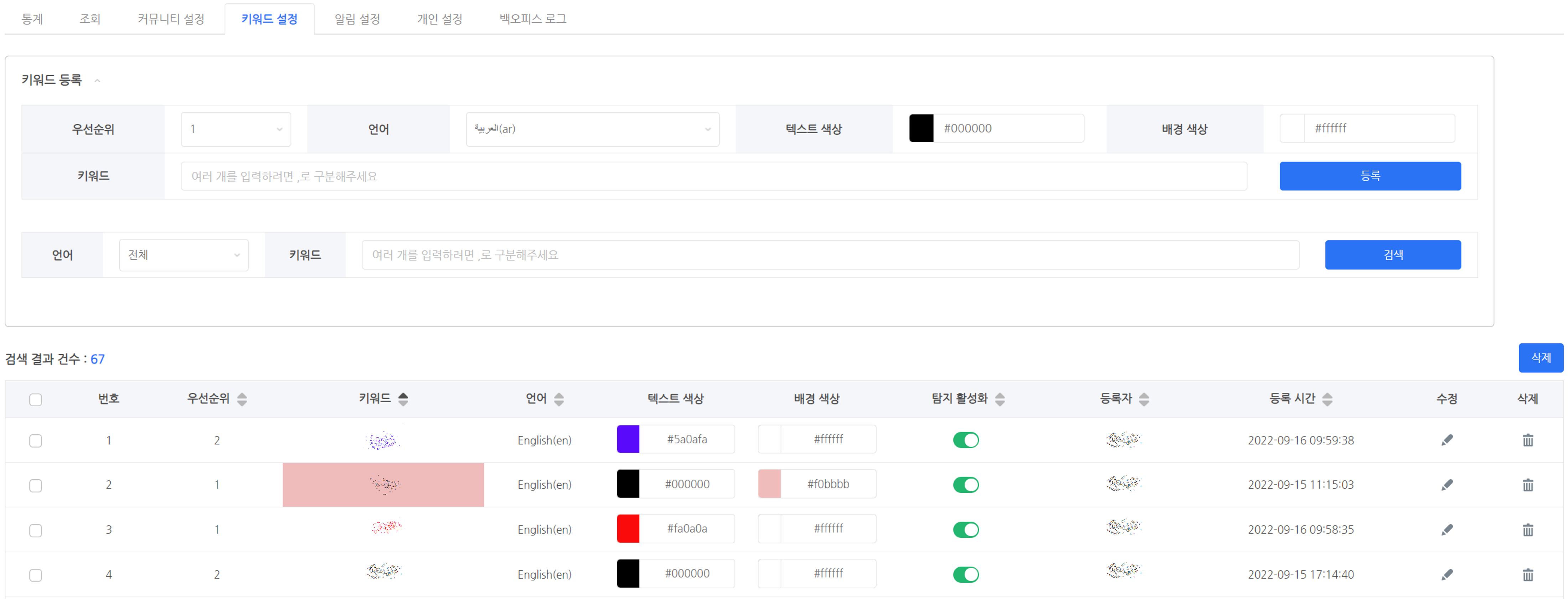 - 키워드: 등록된 키워드를 검색합니다. 콤마로 구분하여 여러 개를 입력할 수 있으며, 키워드의 일부 문자만 검색해도 해당 문자를 포함한 키워드들의 목록을 볼 수 있습니다.