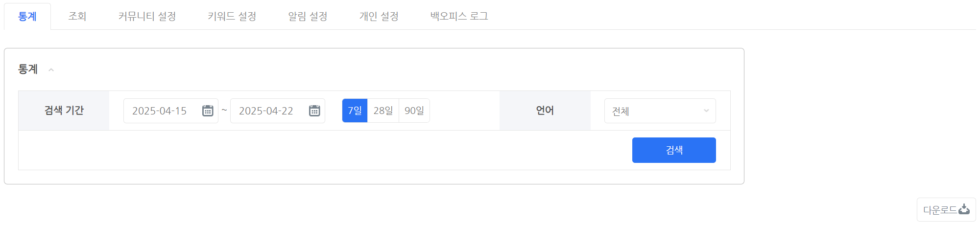 - 검색 기간: 7일, 28일(4주), 90일 버튼을 이용해 검색 범위를 설정할 수 있습니다. 설정 시, 각각 오늘로부터 해당 날짜만큼 이전 날짜가 설정됩니다. 개인 설정에서 검색 기간을 설정하지 않은 경우 기본값은 7일 전부터 오늘까지입니다.