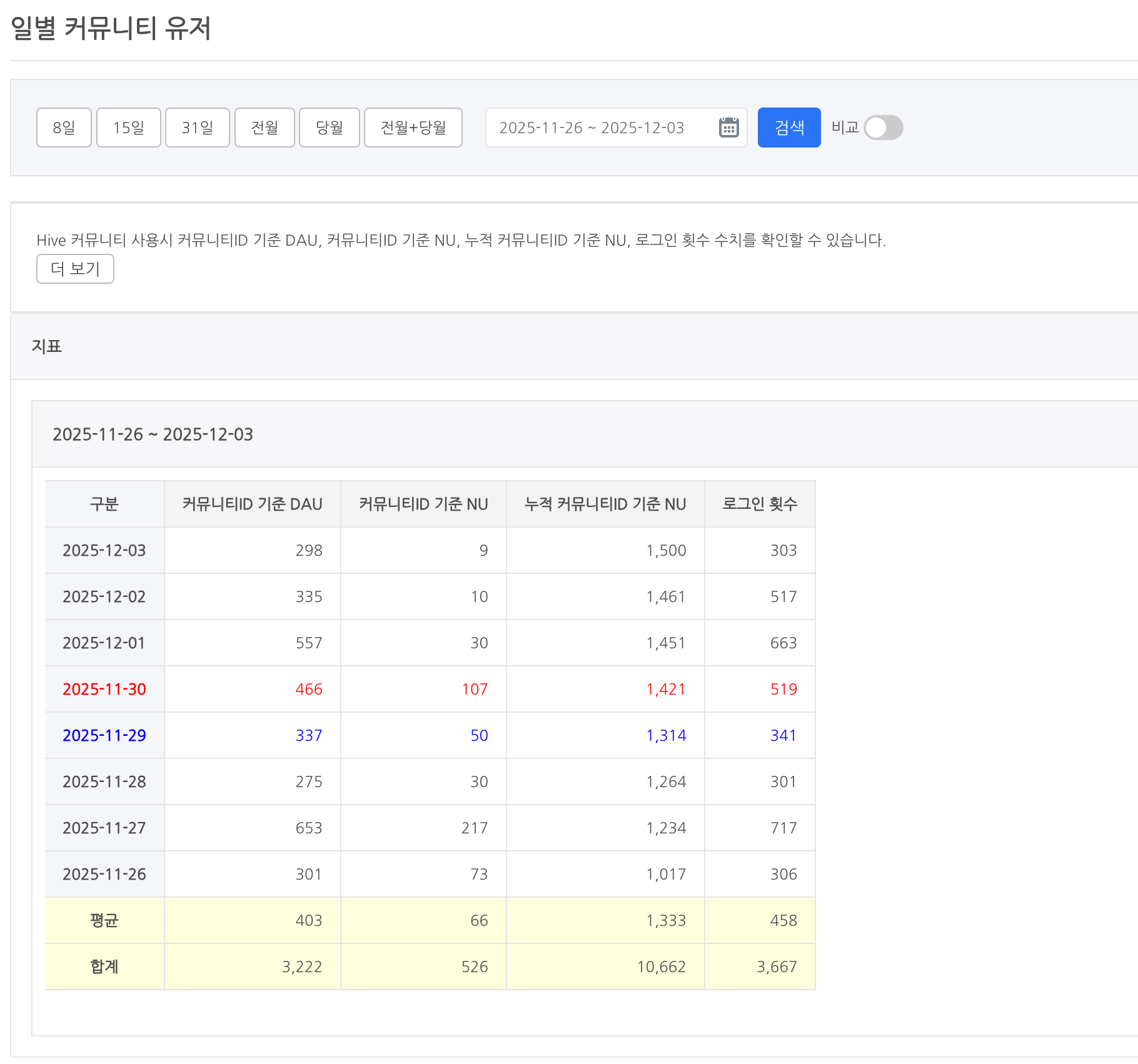| * 상세 분석 지표 | Hive 커뮤니티 사용시, 커뮤니티 현황을 상세하게 파악할 수 있도록 각 지표에 대해 기간 단위의 집계 수치를 제공합니다. | |