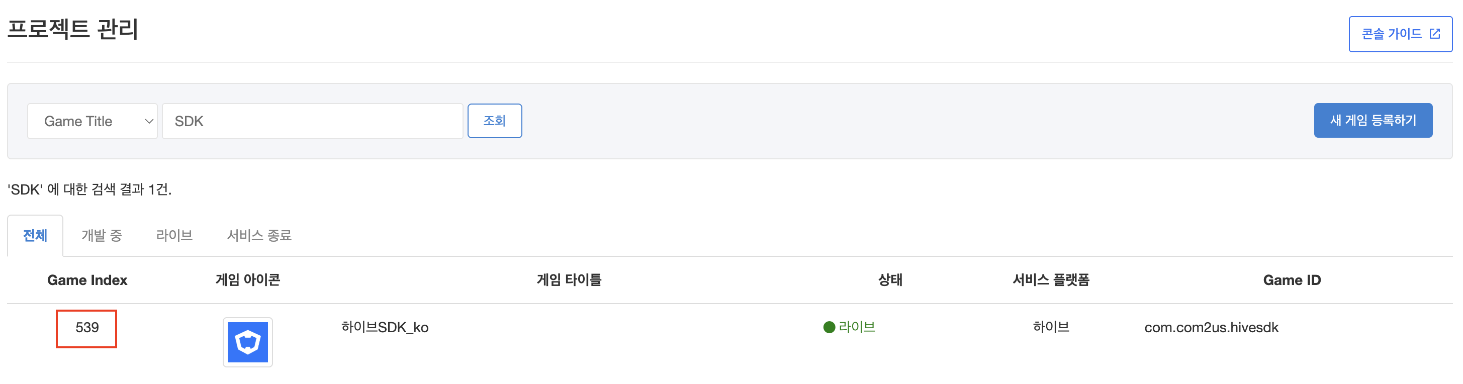 - Hive 콘솔 > 앱센터 > 프로젝트 관리에서 서버 간 알림 수신할 프로젝트의 게임 인덱스를 확인하세요.