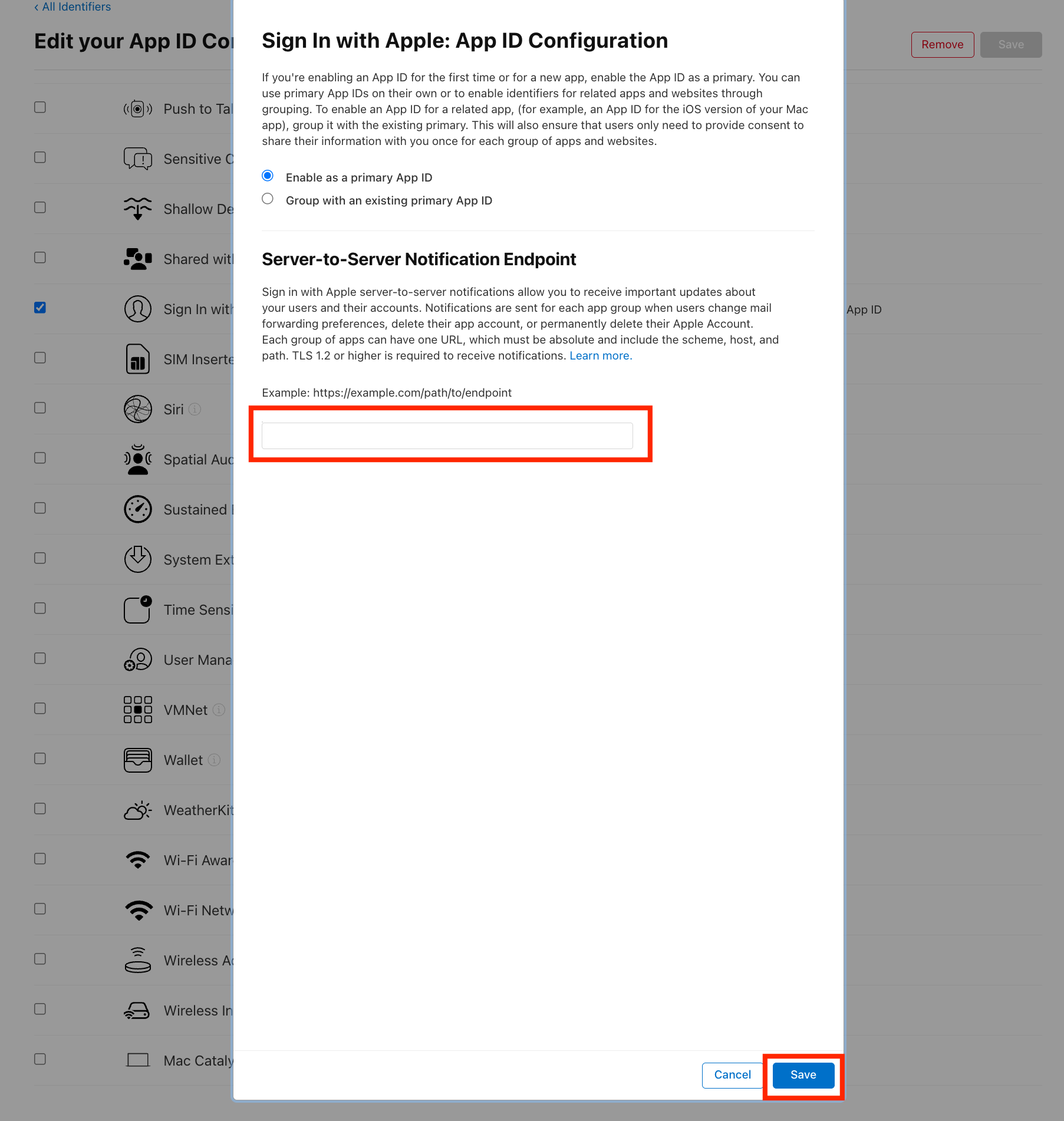 - 'Configure Key' 페이지에서 'Primary App ID' 항목에 'Sign in with Apple'을 사용할 앱 ID를 선택한 후 'Save'를 클릭합니다.