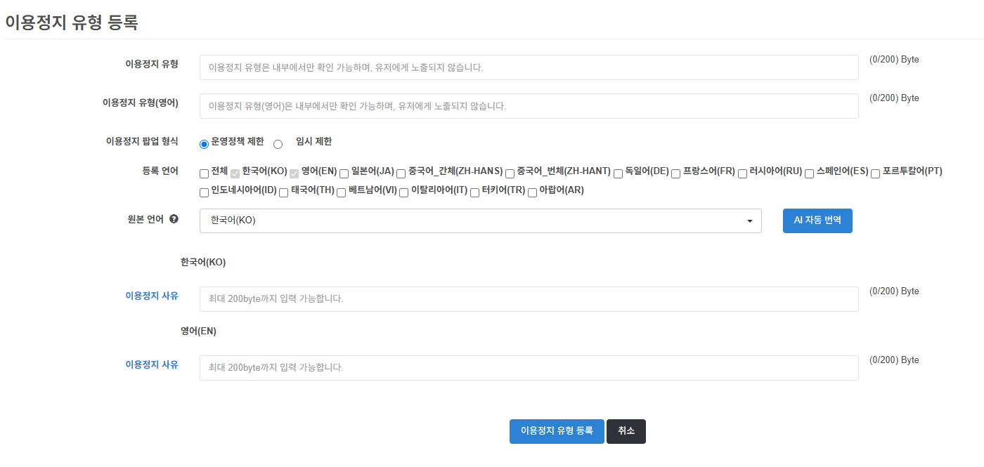 등록 언어는 이용정지 팝업 내에 제공되는 16개 언어를 지원합니다. 한국어와 영어가 필수이며, 등록되지 않을 경우 이용정지 유형이 등록되지 않습니다. 등록되지 않은 언어일 경우에는 영문으로 표시됩니다. -