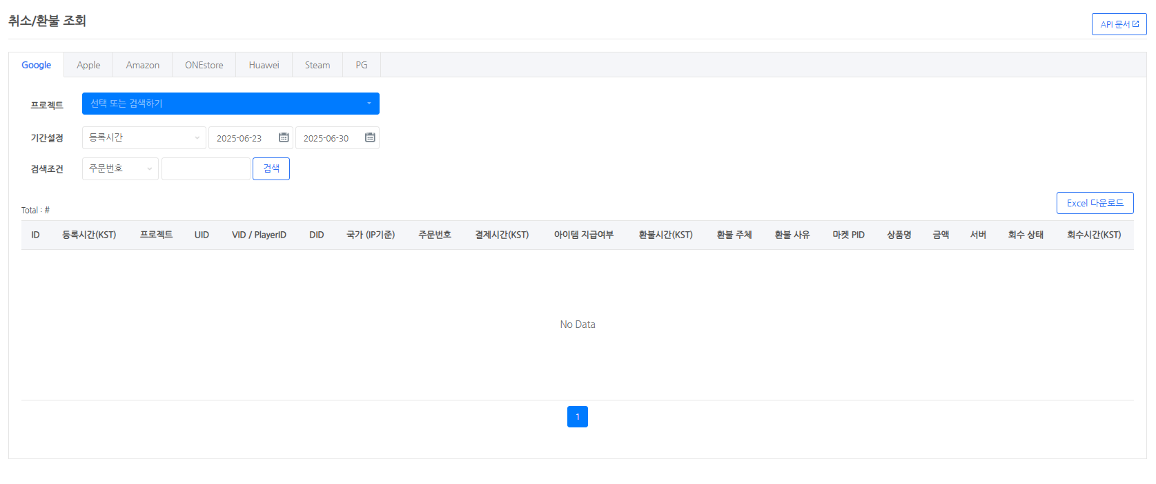 - 현재 취소·환불 조회 메뉴에서 지원하는 마켓은 Google, Apple, Amazon, One store, Huawei, Steam, PG 결제입니다.