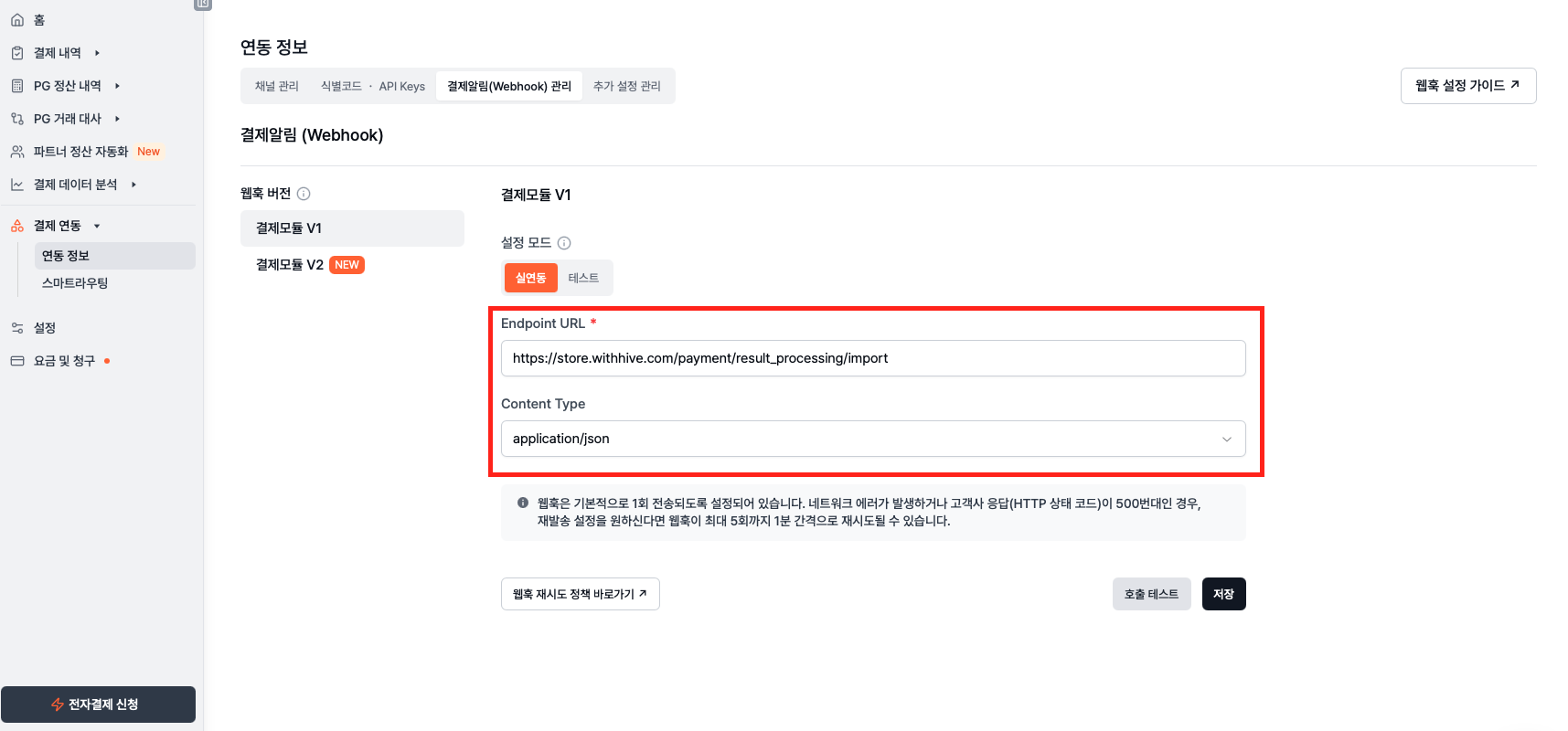 - AppID의 마켓 정보가 '직접 배포(direct)'인 경우에만 PG 설정 목록에 표시되며, 그 외 AppID는 노출되지 않습니다.