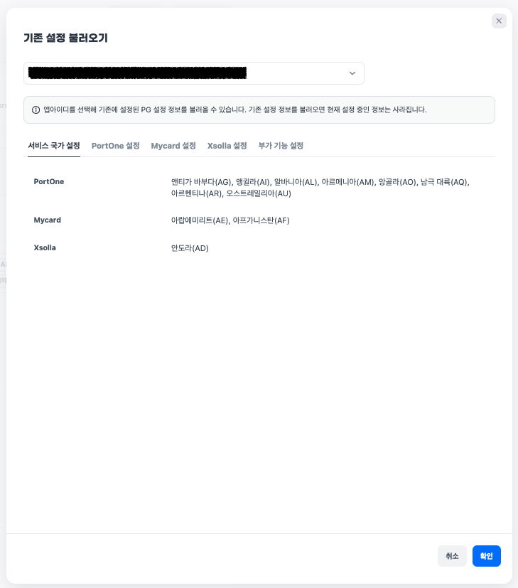PG 설정 중 다른 AppID의 정보를 참고하거나 적용하려면 기존 설정 불러오기 기능을 사용하세요.