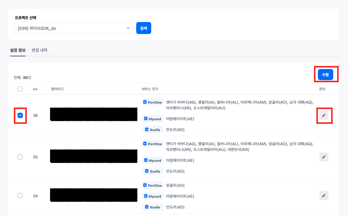 - 선택한 모든 AppID에 동일한 PG 정보를 적용하려면, 원하는 AppID를 선택한 뒤 수정 버튼을 클릭해 주세요.
