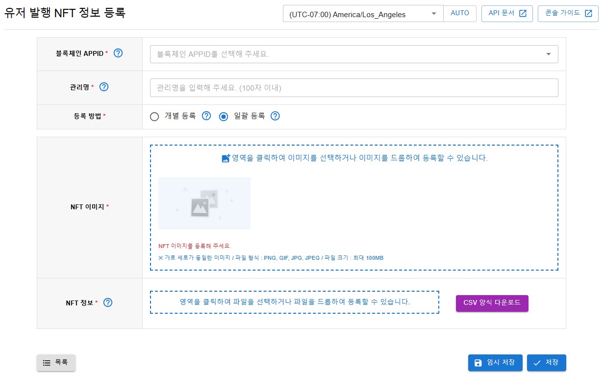 - 일괄 등록 : NFT 상세 정보를 다수개씩 CSV를 통해 일괄 등록합니다.