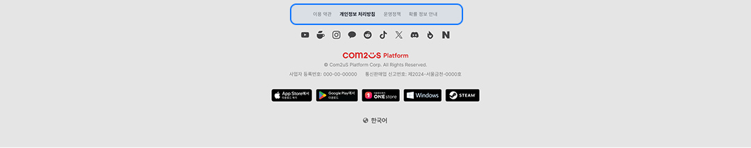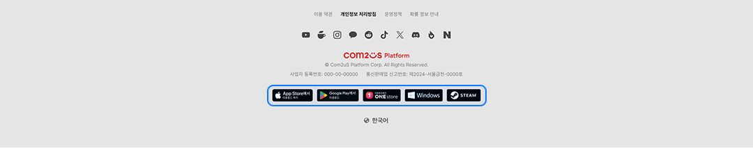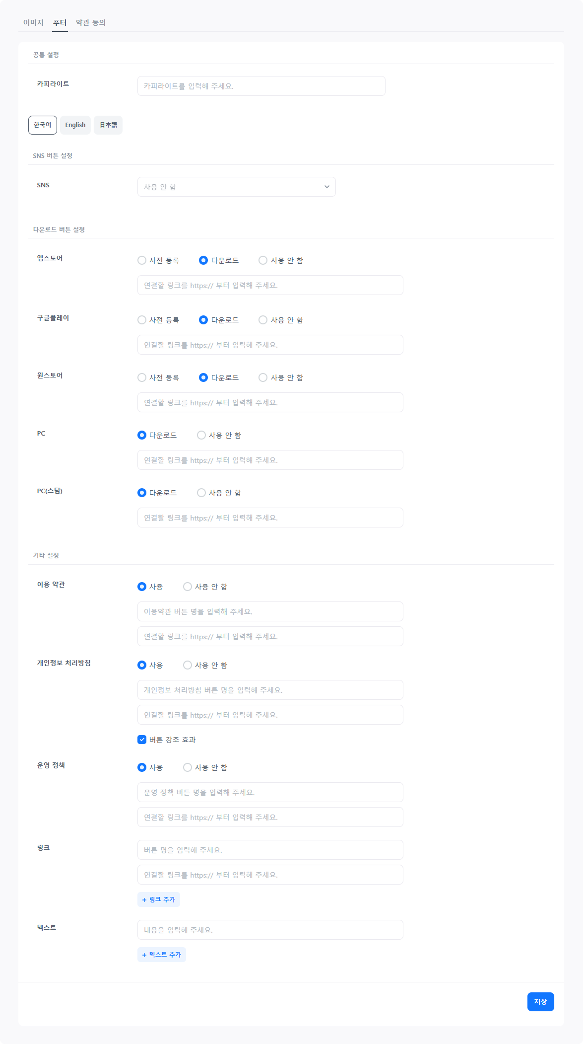 웹사이트 하단 푸터에 노출할 다양한 요소들을 설정할 수 있는 화면입니다. 게임 다운로드 링크, SNS 채널 연결 등을 추가하여 유저들이 게임과 관련된 주요 채널에 쉽게 접근할 수 있도록 구성할 수 있습니다.