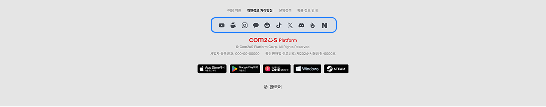 커뮤니티와 웹 상점에 공통으로 노출되는 항목을 등록하거나 기능을 설정합니다. 하단 푸터에 노출되는 SNS 아이콘 및 기타 설정 항목은 사이트 언어별로 등록할 수 있습니다.