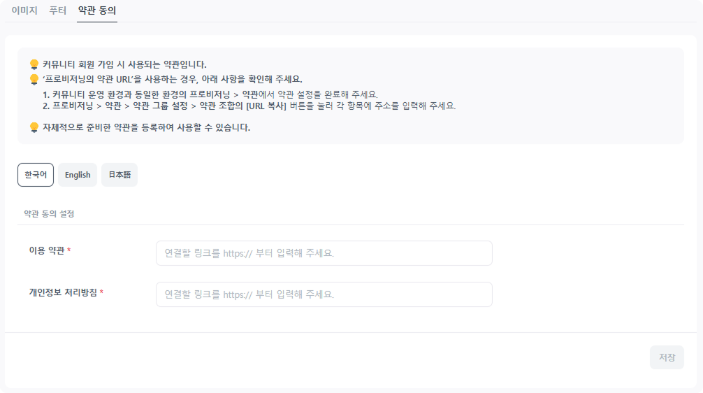 커뮤니티에 신규 가입하는 경우 노출하는 이용약관, 개인정보 처리방침을 설정합니다. 인게임을 통해 커뮤니티에 접근하여 계정이 생성된 경우, 약관 동의 과정은 생략됩니다. 웹 로그인 약관은 필수 설정 항목이며, 설정되지 않으면 커뮤니티 로그인이 정상 동작되지 않습니다.