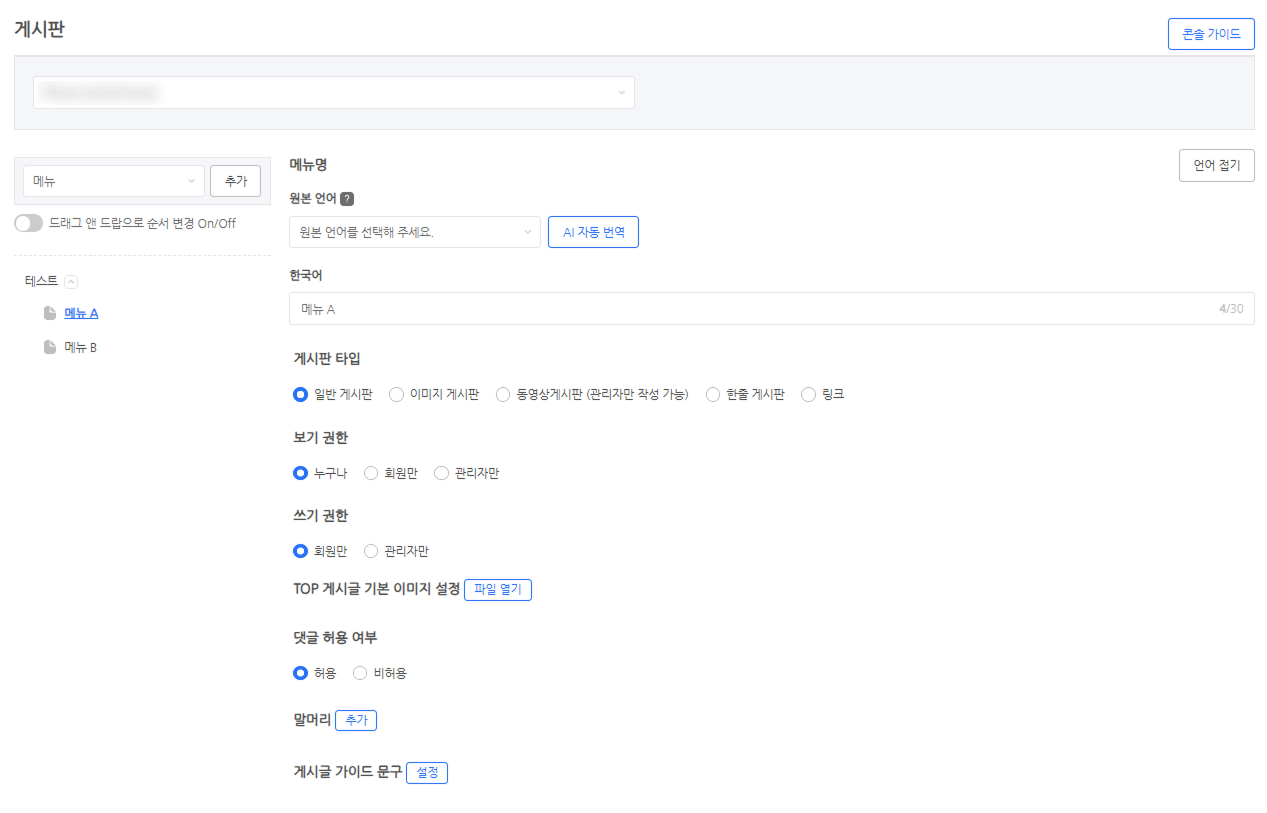 • ex. 한국어, 일본어 박스에 카테고리 등록 시, 한국어/일본어 사이트에 카테고리가 생성됩니다.