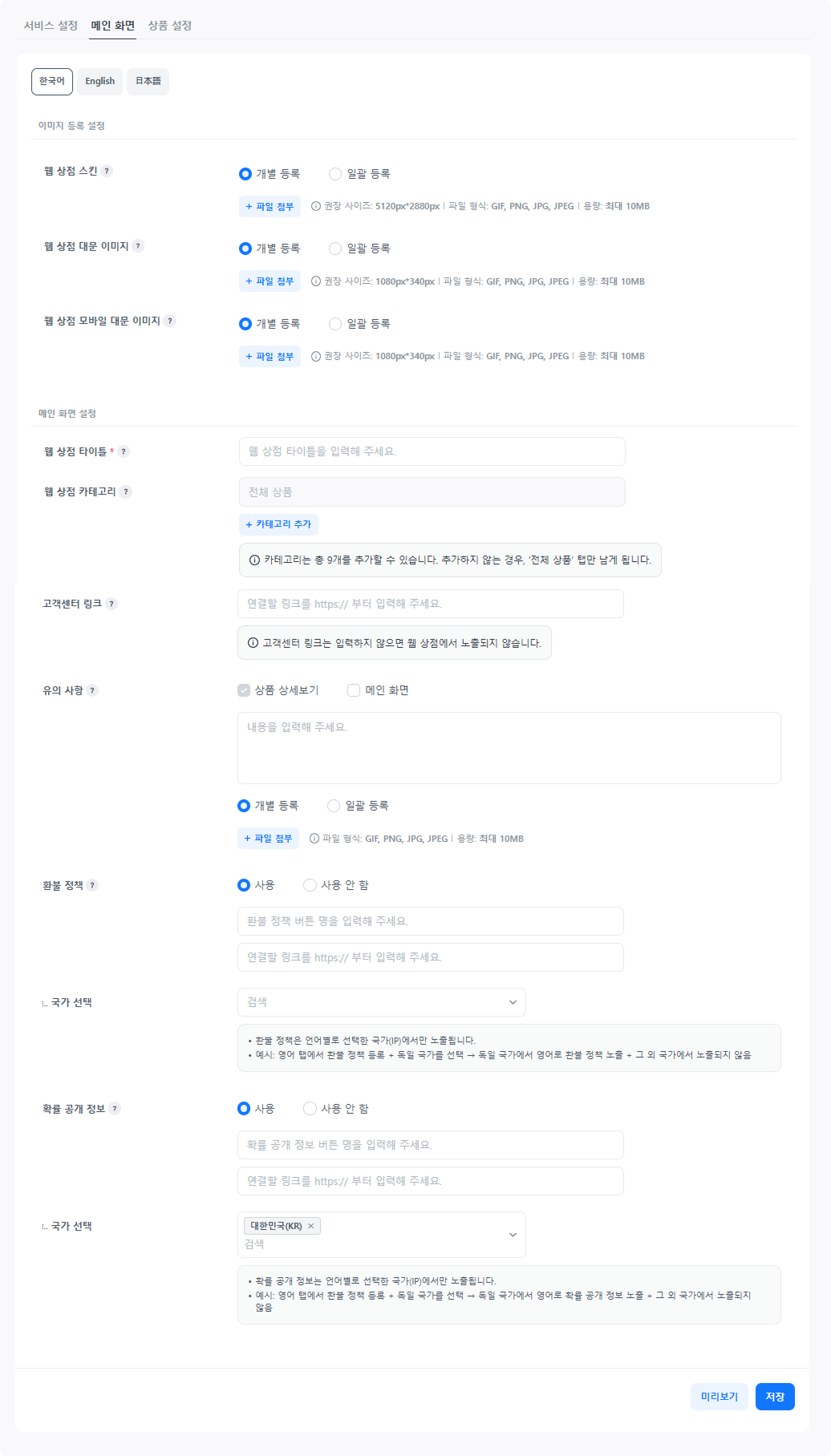 웹 상점 메인에 노출되는 이미지 에셋을 등록하거나 기능을 설정합니다. 언어별로 등록 가능하며, 이미지는 일괄 등록 기능을 사용하여 빠르게 등록할 수 있습니다.