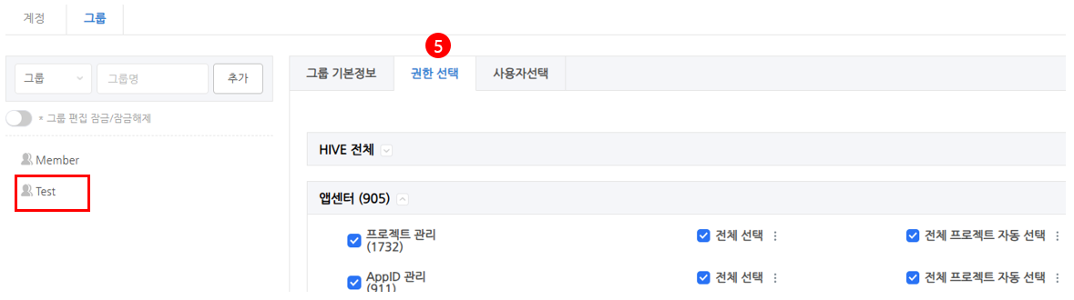 [5] 권한 선택 : 선택한 권한 그룹에 메뉴 권한을 설정할 수 있으며, 그룹에 소속된 사용자에게 권한이 부여됩니다. 권한을 설정하는 방법은 ‘개인 권한 부여’와 동일합니다.