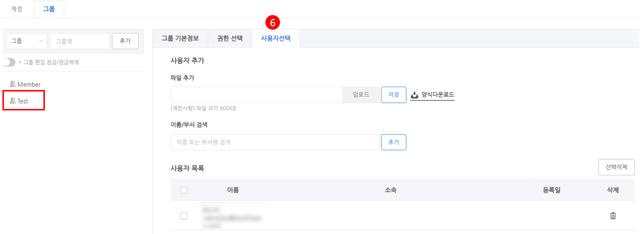 [6] 사용자 선택 : 선택한 그룹 내 권한을 부여할 사용자를 검색하여 추가 후 저장 시 권한이 부여됩니다.