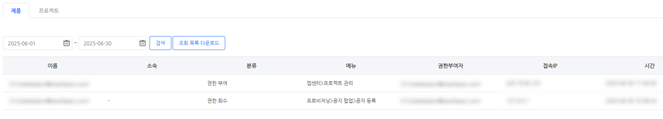 계정 기준으로 지급된 제품 페이지의 권한 부여 및 회수 이력을 조회할 수 있습니다.