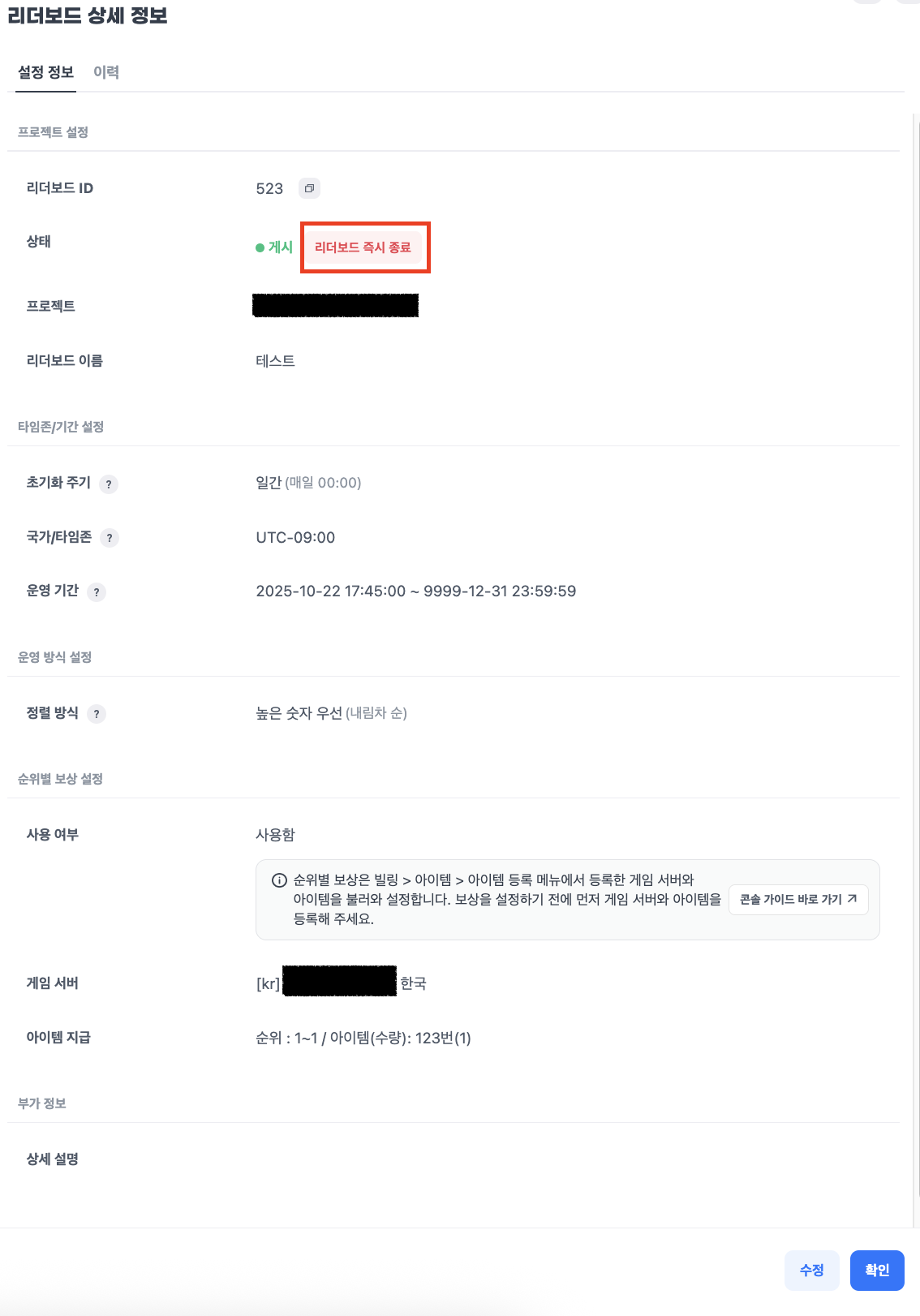 • 즉시 종료 : 버튼 클릭 시 리더보드 서비스를 즉시 종료합니다. 리더보드 운영 중 즉시 종료해야 할 필요가 있을 경우 사용합니다.