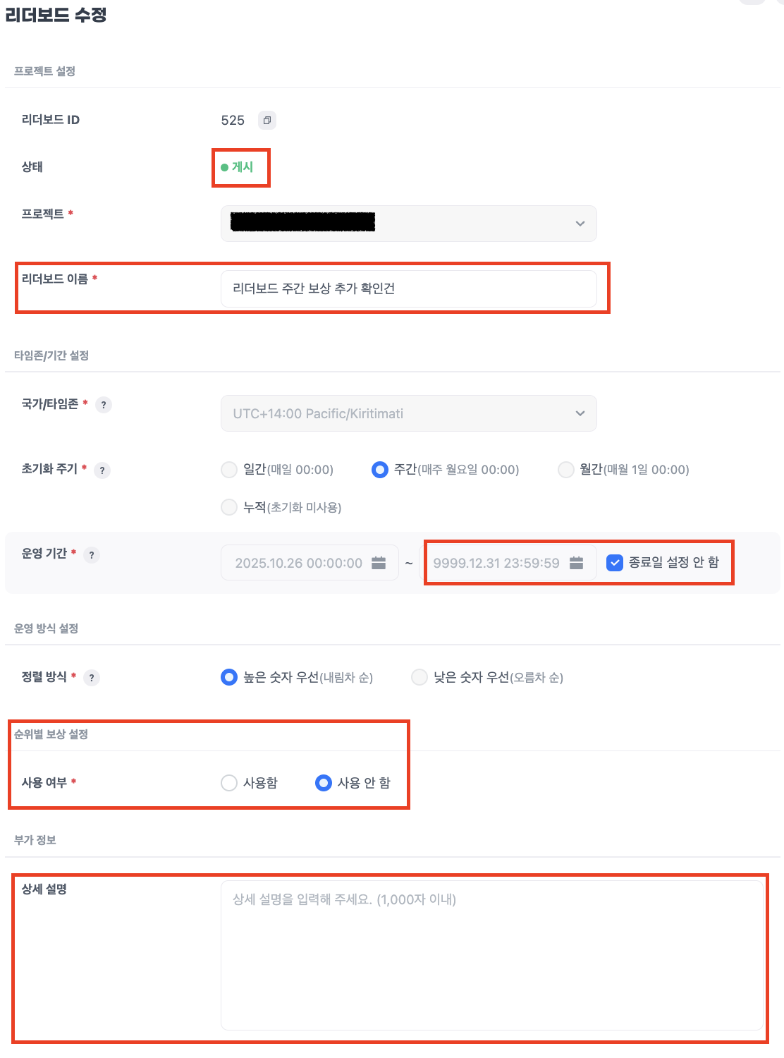 • 상세 설명 : 리더보드에 대한 설명을 자유롭게 입력할 수 있습니다.