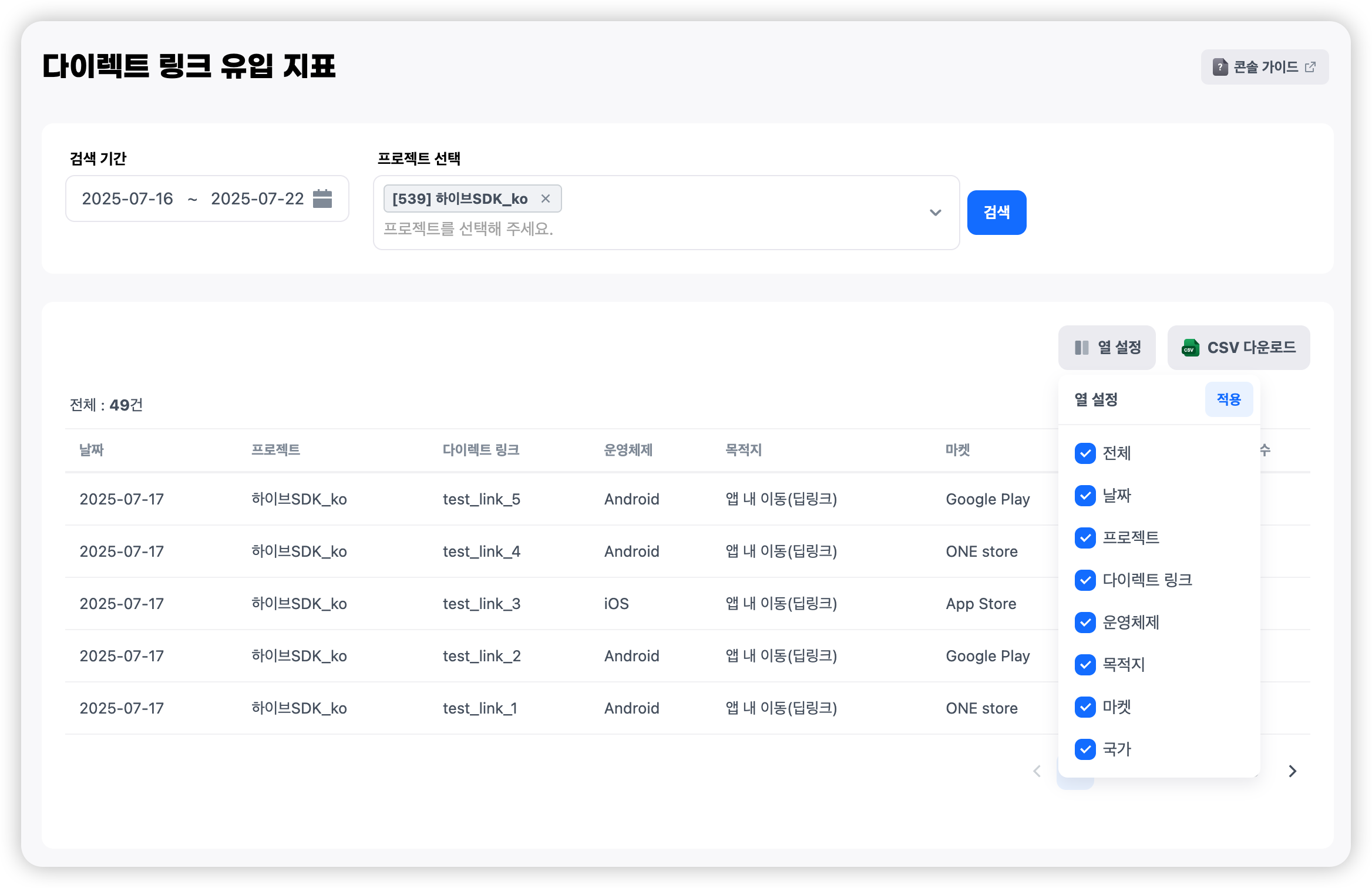 콘솔 가이드 > 프로모션 > 유저 참여 > 다이렉트 링크 유입 지표 다이렉트 링크 유입 지표¶ '콘솔>프로모션>유저 참여>다이렉트 링크 유입 지표'로 이동합니다. 다이렉트 링크를 클릭한 유저들의 상세한 데이터를 제공합니다. OS, 국가, 언어는 물론, 어떤 마켓이나 특정 목적지(앱 내 위치, 웹 URL 등)로 유입되었는지에 대한 클릭 수치 정보를 확인할 수 있습니다.